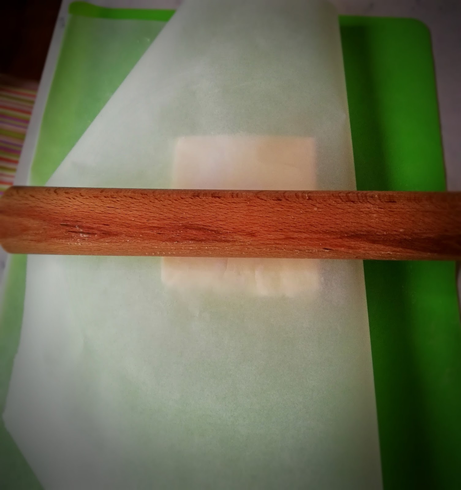 Nel frattempo, per stendere il burro per la sfoglia, prendere un pezzo di carta da forno e infarinarlo. Appoggiare sopra il panetto di burro leggermente infarinato e coprire con altro pezzo di carta. Iniziare a picchiettare con il mattarello, e piano piano stenderlo.