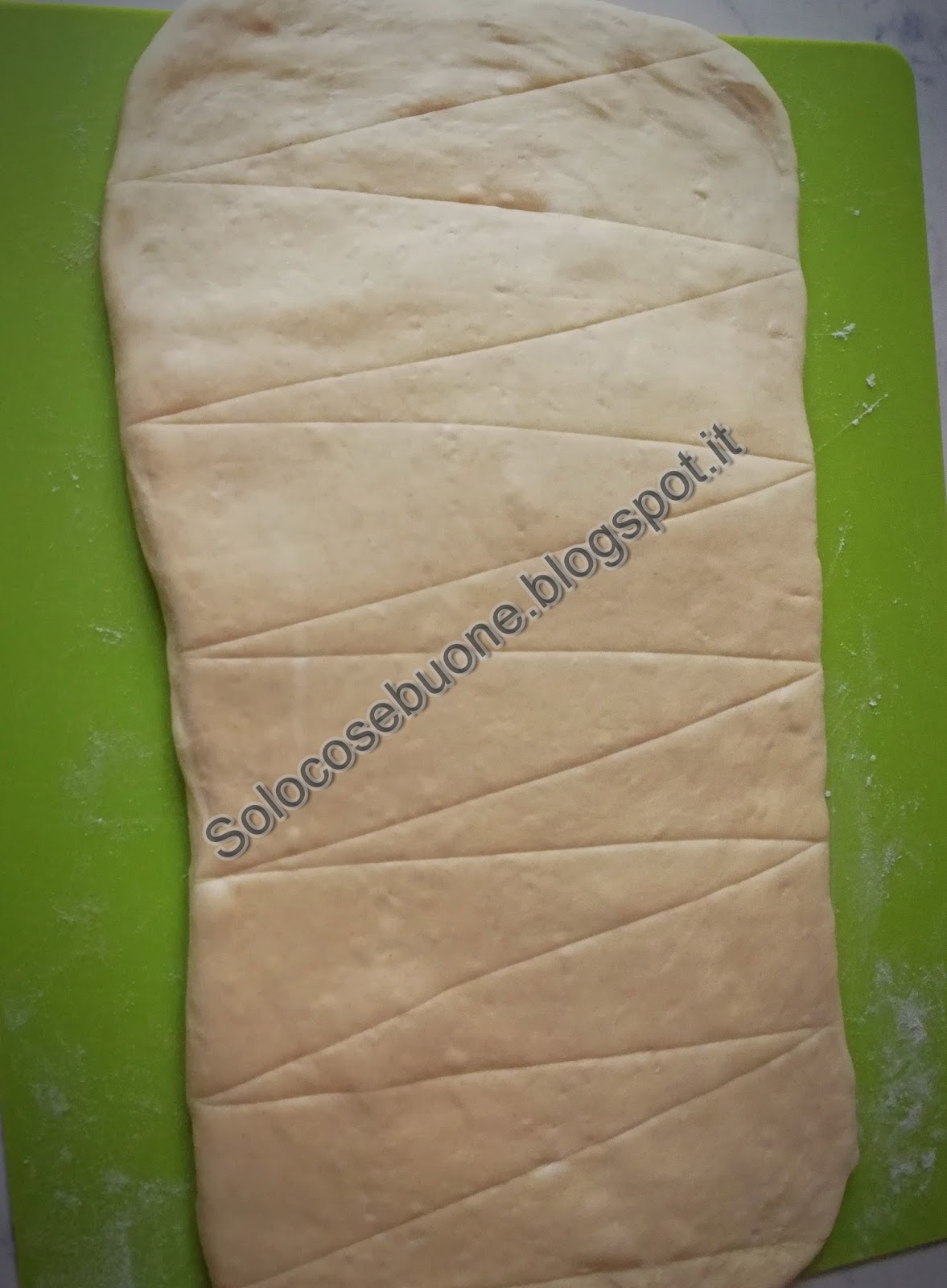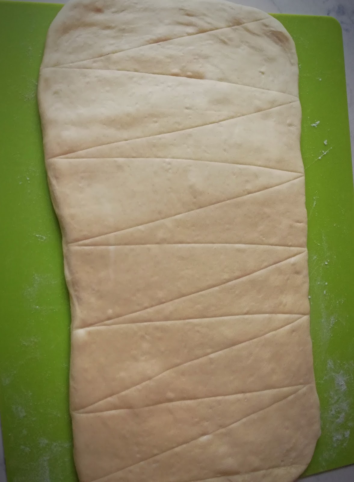 Riprendere l’impasto dal frigorifero, non preoccupatevi se non sarà lievitato moltissimo , e trasferirlo in una spianatoia leggermente infarinata, quindi, con l’aiuto del mattarello, ricavare un rettangolo di pasta largo 20 cm, con uno spessore di circa 1 cm ,la sua lunghezza non ha importanza.