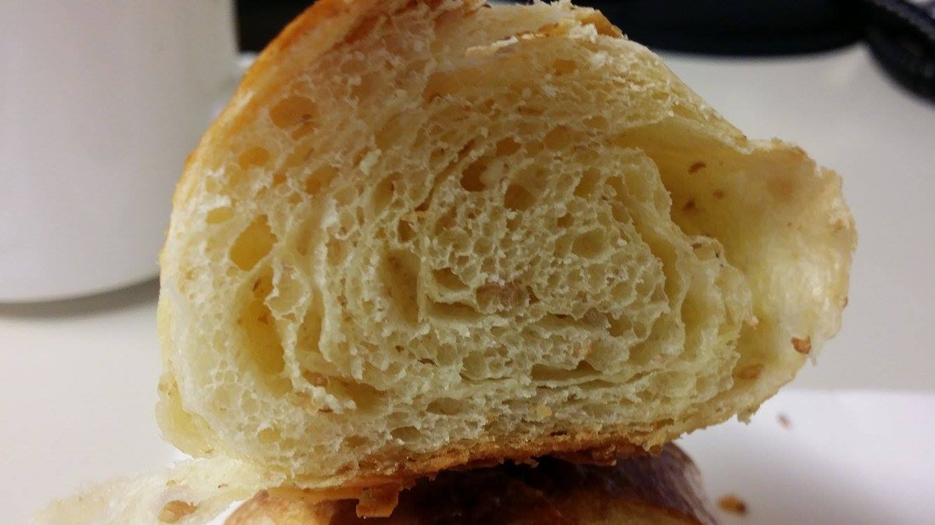 Devo dire il risultato è stato soddisfacente il cornetto risulta croccante all’esterno e morbido dentro, l’impasto era molto morbido e l’ho lavorato da freddo mente ho utilizzato burro piatto che invece ho lasciato che raggiungesse i 19 gradi, a mio avviso il connubio impasto freddo e burro piatto a 19 gradi (altrimenti sostituibile con burro tedesco appiattito precedentemente e lasciato riposare 3 ore in frigorifero poi portato alla temperatura di 15 gradi), il fatto che fosse così morbido mi ha permesso anche di poter sfogliare bene senza strappi.
