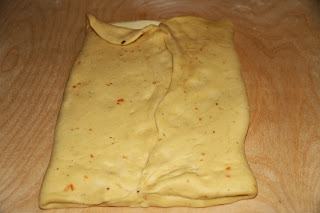Passato il tempo del riposo tiriamo fuori il burro dal frigorifero, stendiamo la pasta a forma di rettangolo, cercando di formare un rettangolo che sia esattamente il doppio di quello fatto con il burro, poggiamo il burro a metà dell’impasto e chiudiamo a libro, tirare la sfoglia, pressando con il mattarello non ruotando e sempre nello stesso verso ad altezza 1 cm se avete tempo mettete in frigorifero per 30 minuti poi procedere con la prima piega a 3 se non avete tempo fatela subito, e mettete in frigorifero per 30 minuti, quindi fare una piega a 4, se vedete che mentre la stendete si sfalda e perde burro qualcosa non è andata bene, e va raffreddata 10 minuti in freezer o 30 in frigorifero, dopo l’ultimo riposo stendete la pasta formando un quadrato di di altezza 3 mm, tagliare in 2 e tagliare ulteriormente in tanti triangolini, ed arrotolate, o formate a piacere.