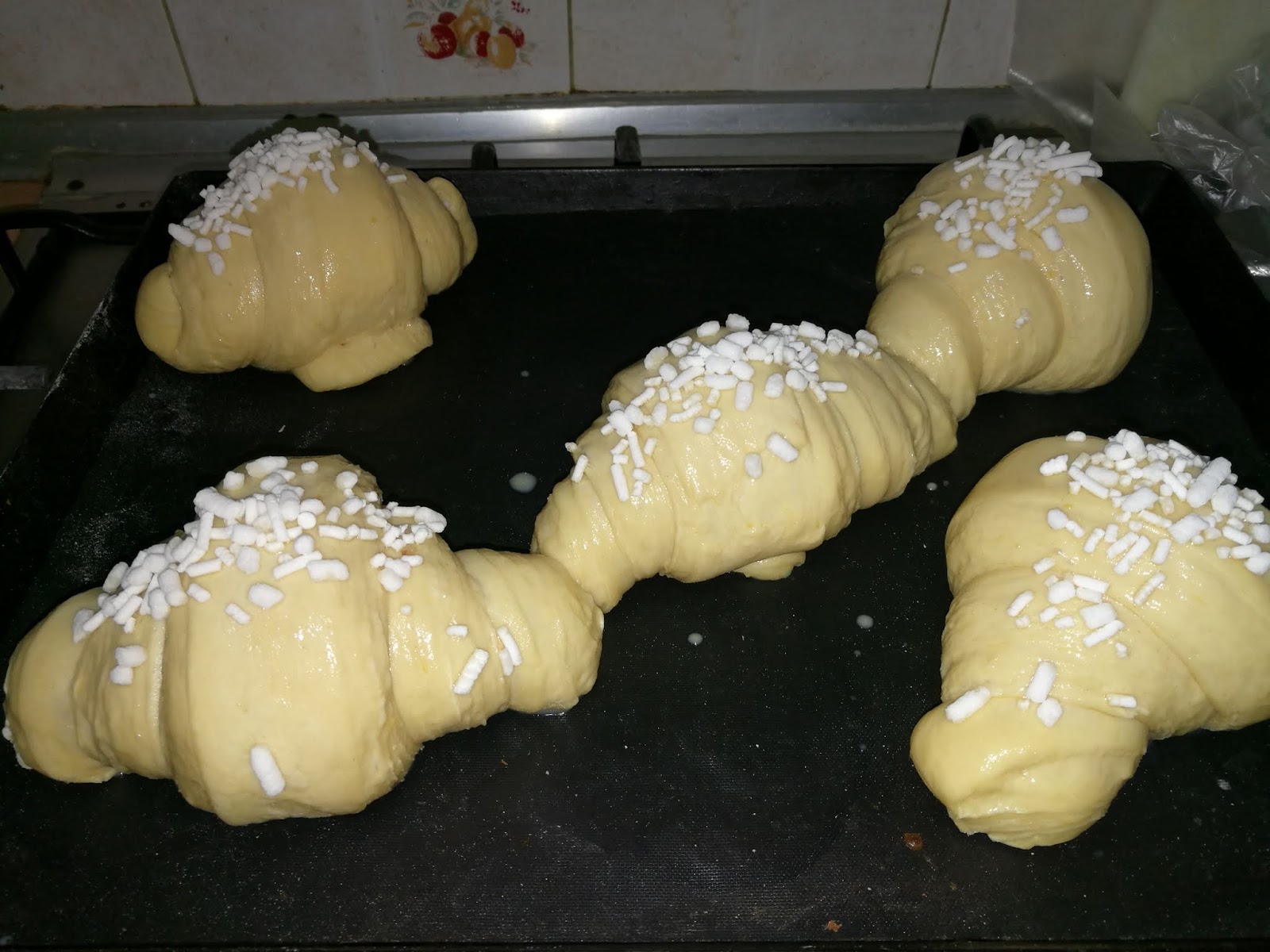 Stendere a rettangolo ad uno spessore di 3 mm, tagliare dei triangoli, chiudere a forma di cornetto e far lievitare a 26°C per 3-4 ore.