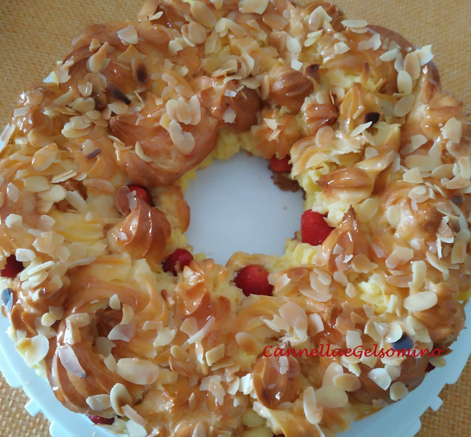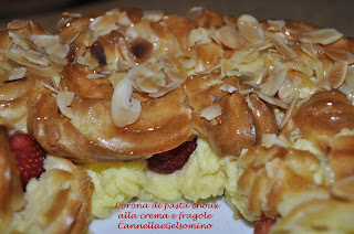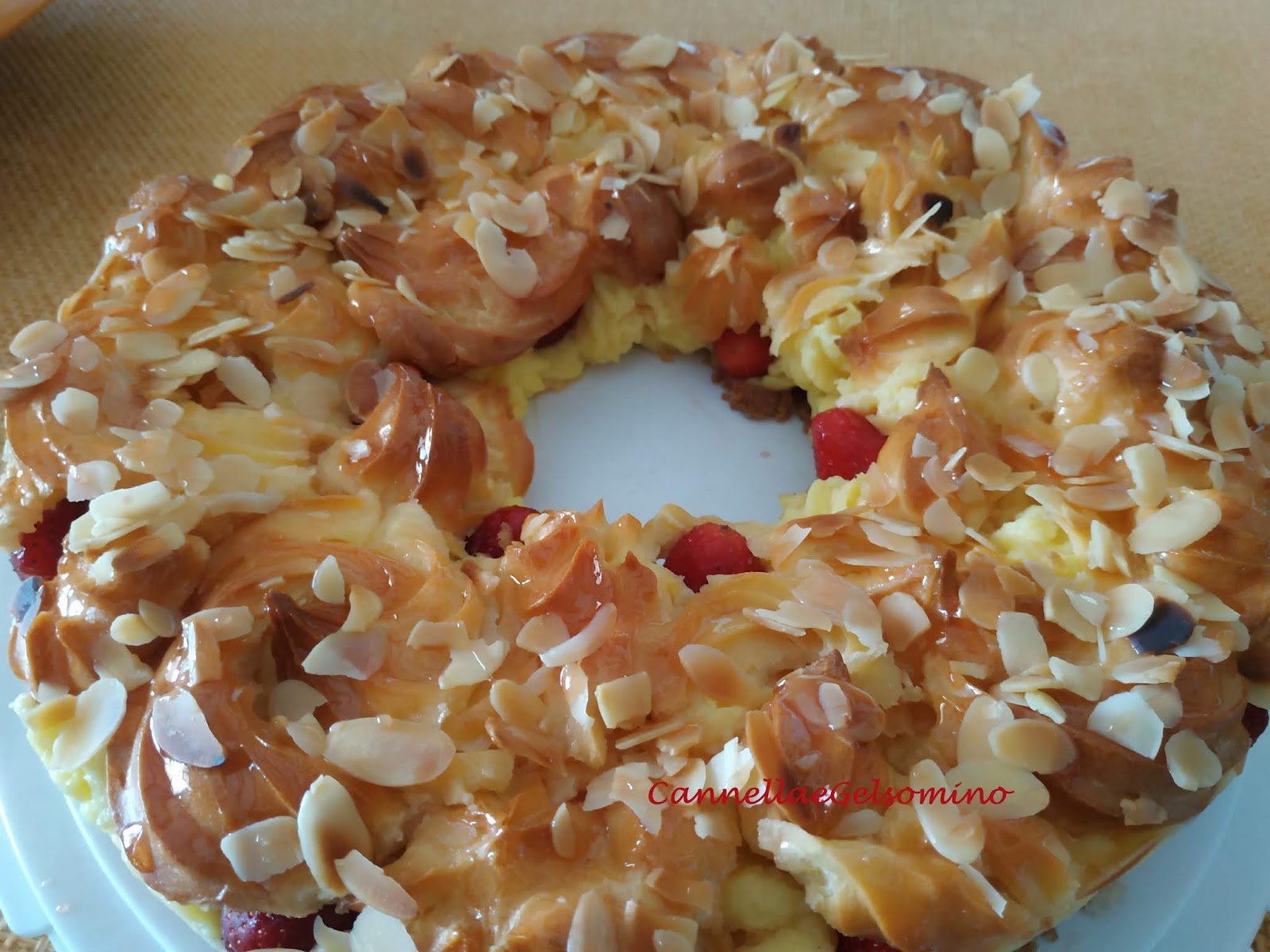 Quando sarànno raffreddati sia la corona sia la crema, tagliate a metà la corona e farcite con la crema (io ho utilizzato crem,a pasticcera e ho aggiunto fragole a pezzetti). Mettete la calotta superiore sulla crema e lucidate con gelatina neutra.