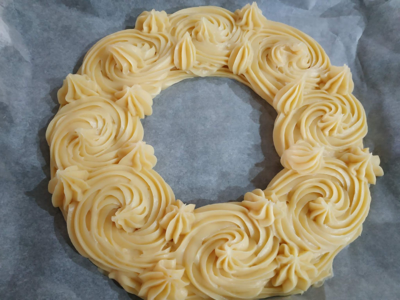 Disegnate su un foglio di carta da forno il cerchio che vi farà da guida per la corona; seguendo il vostro estro realizzate il dolce, utilizzando tutto l’impasto. Mettete tutto sulla placca da forno.