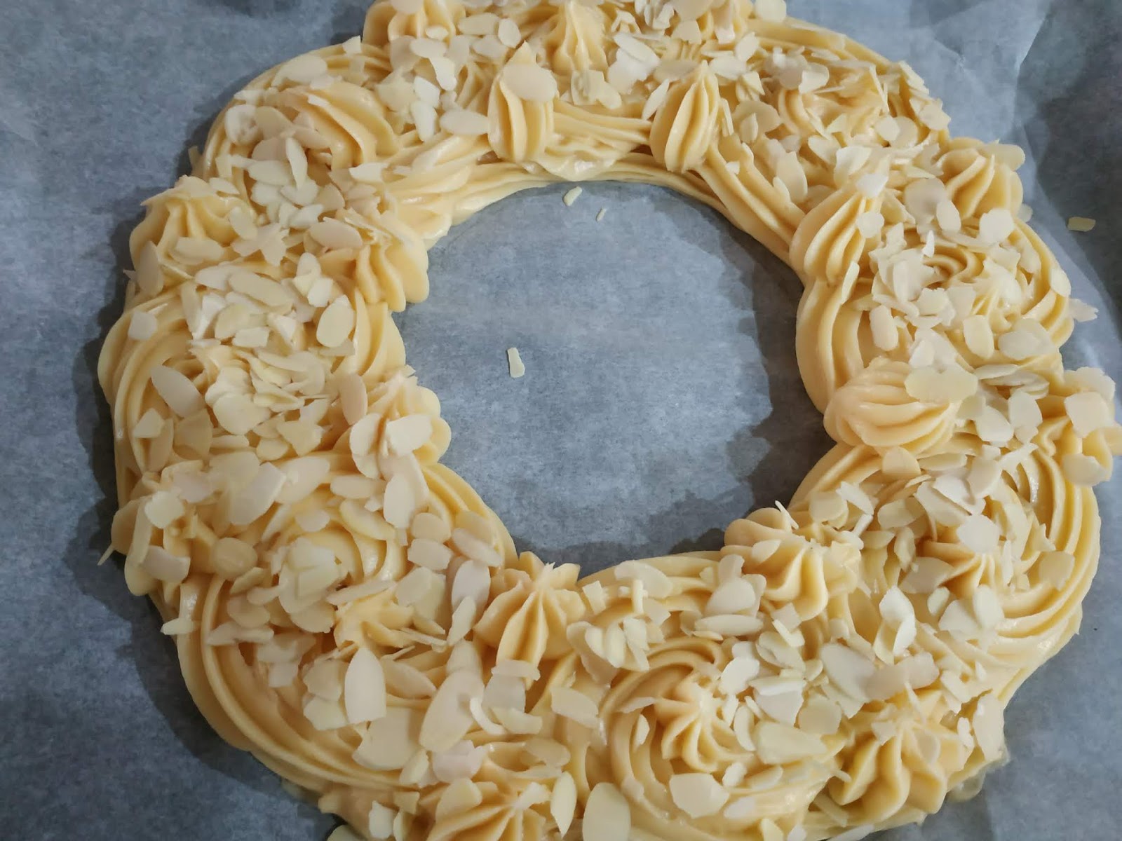 Ingredienti per la pasta choux: 185 g di acqua, 165 g di burro, 175 g di farina 00, 25 g di latte intero fresco, 270 g di uova intere, 1 pizzico di sale, 50 g di mandorle sfilettate.