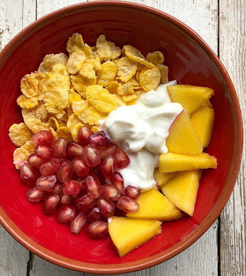Yogurt greco 0%, melagrana, mango, Corn-Flakes