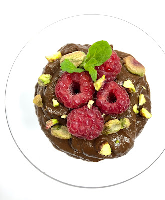 vegan chocolate mousse all’avocado, lamponi e pistacchi