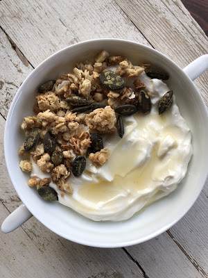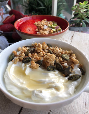 yogurt greco 0% sciroppo d’agave, granola, semi di zucca tostati e leggermente salati