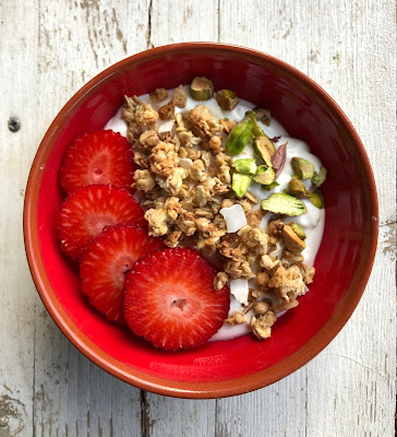 Yogurt magro al cocco, granola pistacchio e fragole fresche