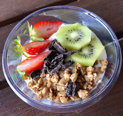 Bowl di yogurt cioccolato fondente 90%, granola kiwi e fragole