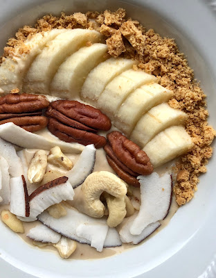 Yogurt al malto, pecan, cocco in scaglie disidratato, anacardi, banana e crunch di digestive