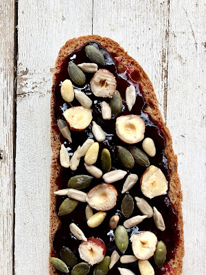 Pane ai cereali, confettura Bio di mirtilli neri e frutta secca