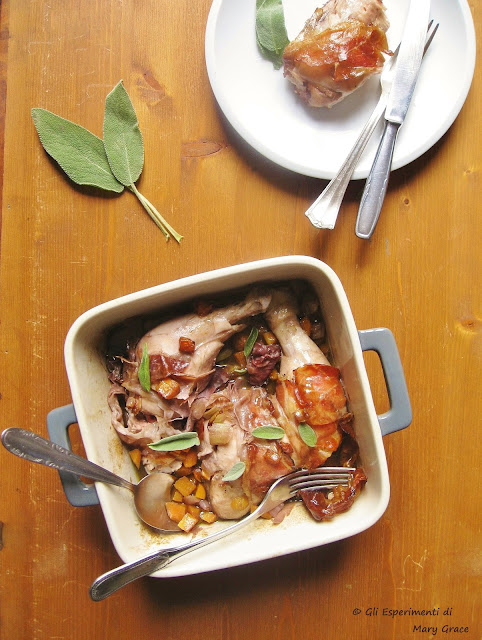 Terminata la cottura, trasferire le cosce di pollo su un piatto da portata insieme alla salsa di verdure e servire insieme ad un contorno di patate al forno profumate alla salvia.