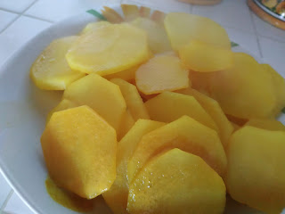 Nel frattempo avrete sbucciato le patate, le avrete tagliate a rondelle sottili, salate e oleate leggermente.