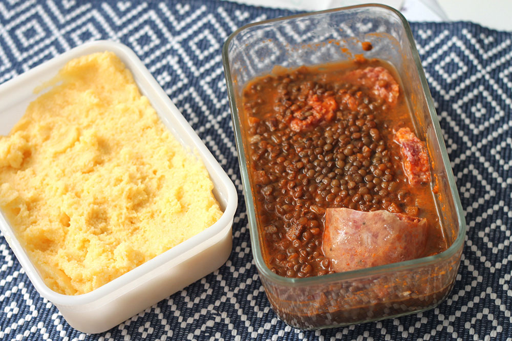 Come detto, abbiamo usato un avanzo di cotechino e lenticchie e della polenta avanzata e conservata in un contenitore rettangolare: in questo modo è stato molto facile tagliare la polenta nella forma adatta. Abbiamo, dunque, tagliato sia la polenta sia il cotechino a cubotti, senza scaldare nulla, tutto a freddo.