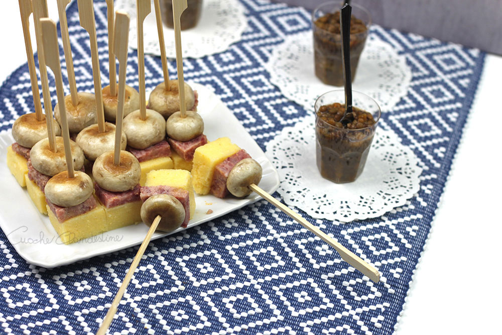 Ognuno può servirlo come meglio crede. Noi abbiamo realizzato questo antipasto con gli avanzi di cotechino e lenticchie, ma potete utilizzare anche qualsiasi altro salume o un formaggio tagliandoli a cubettoni. Quello che serve è un avanzo di polenta: poca roba. Qualche manciata di funghi champignon freschi e comporrete qualcosa di bello da vedere, facile da fare e delizioso da mangiare.