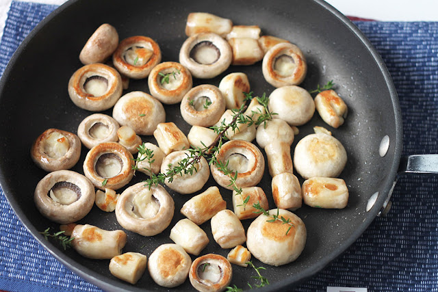Abbiamo saltato gli champignon in padella con poco olio e uno spicchio d’aglio per cinque minuti. Per insaporire: sale e timo. Usate le cappelle necessarie per comporre gli spiedini: quelle che avanzano potrete usarle in un’altra preparazione, magari surgelandole.