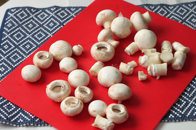 Abbiamo pulito i funghi champignon freschi e abbiamo separato il gambo dalla cappella.