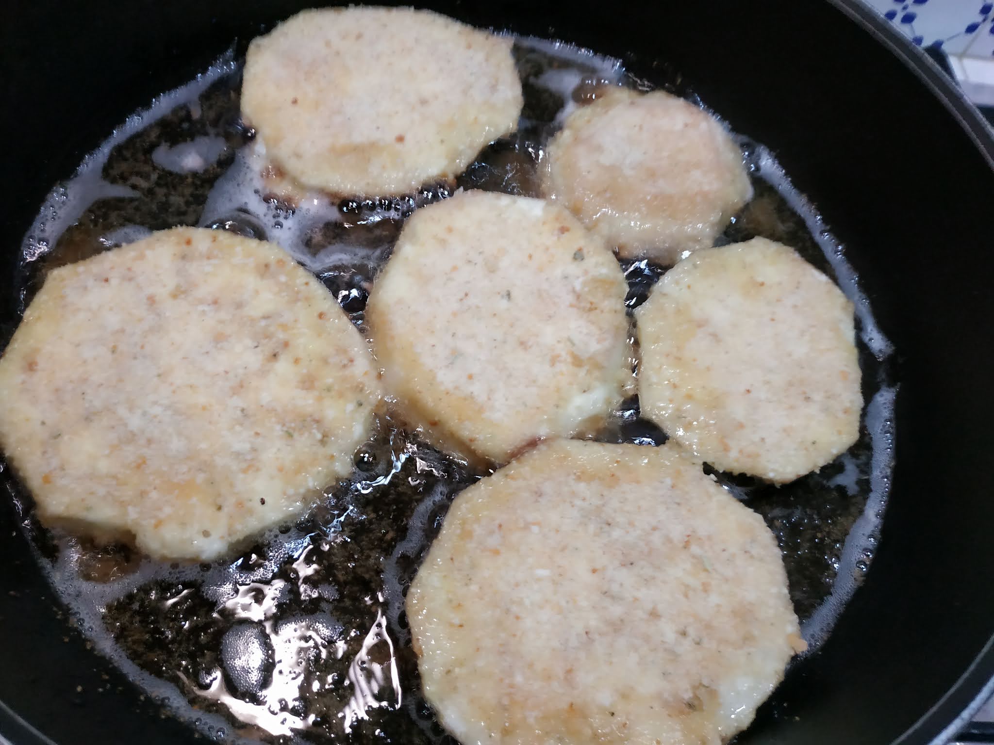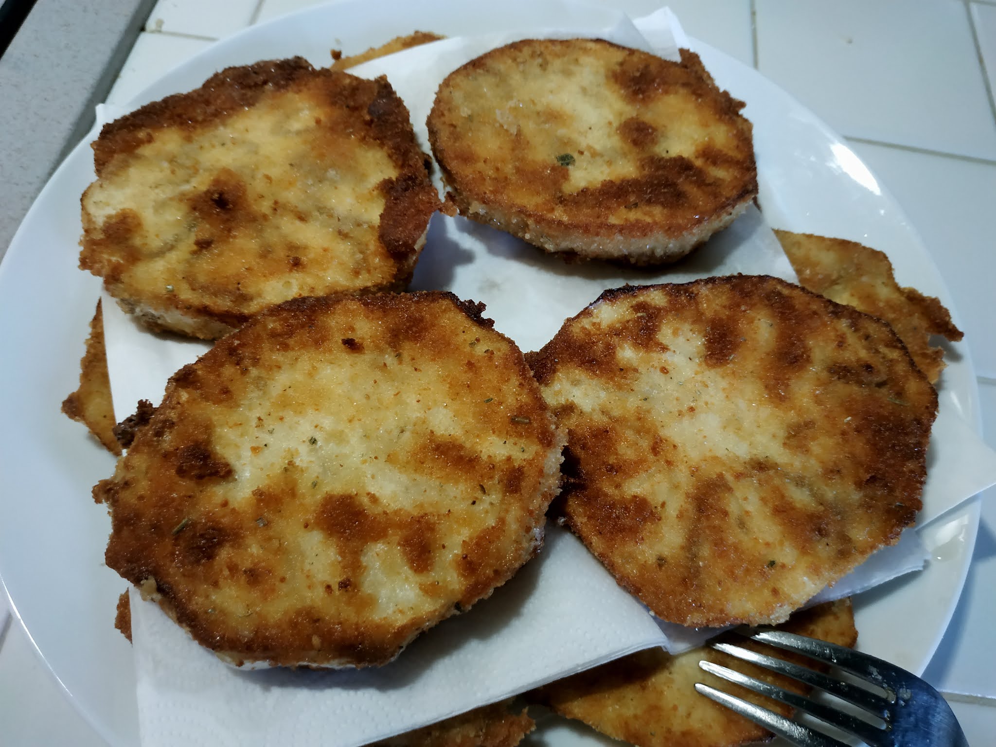 Asciugate bene le fette con carta da cucina, passate ogni fetta prima nell’uovo e poi nella panure. Friggete in olio ben caldo.