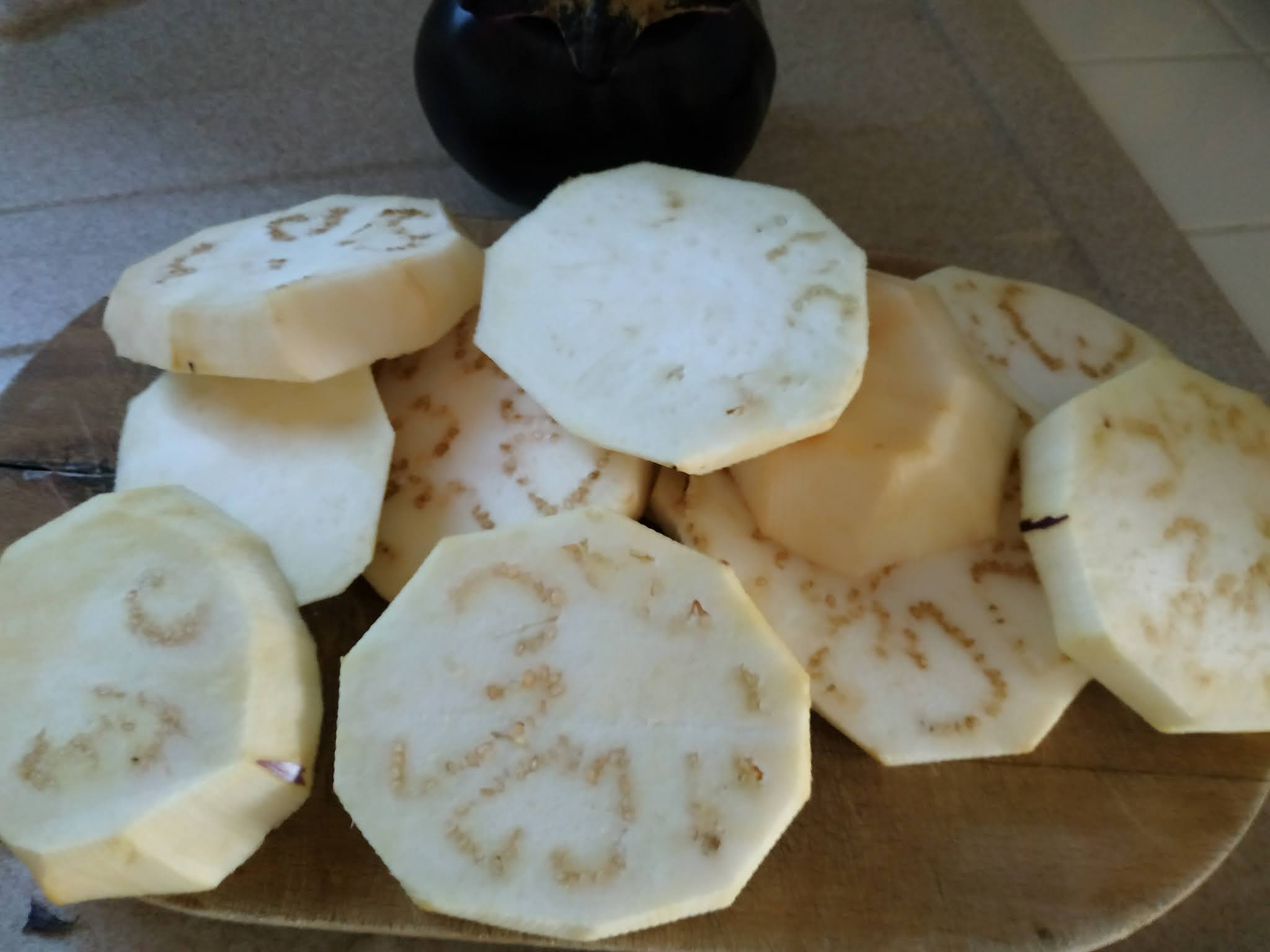 Sbucciare le melanzane, tagliarle a fette non troppo sottili, salare in modo che rilascino un po’ della loro acqua di vegetazione.
