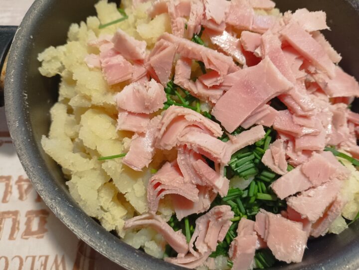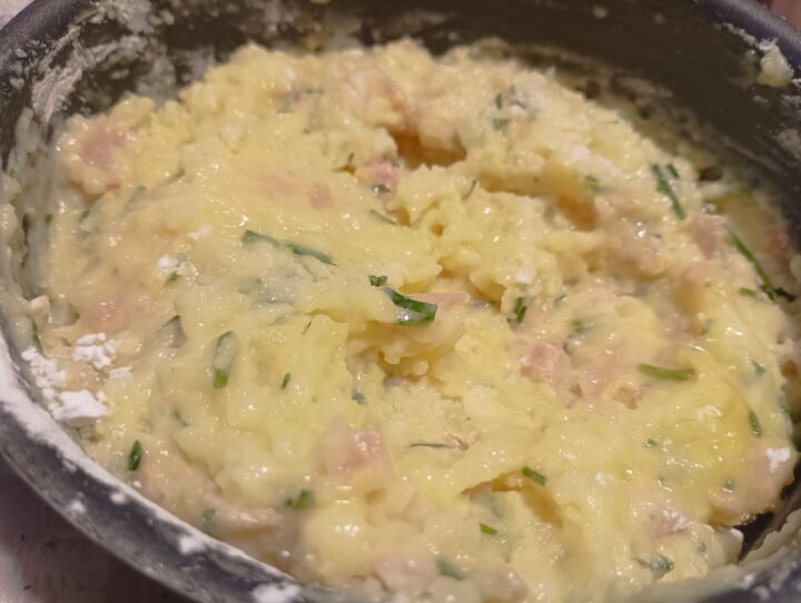 Metterle in una ciotola, unire il prosciutto cotto a pezzetti, il parmigiano grattugiato, l’erba cipollina sminuzzata. Mescolare poi aggiungere l’uovo e la fecola di patate.