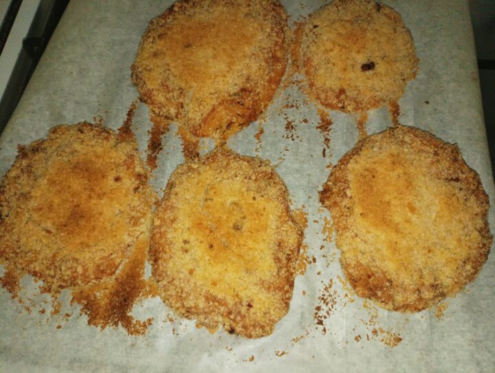 Passarle nel pangrattato e sistemarle su una teglia rivestita da carta forno. Mettere in forno preriscaldato a 180° per circa 20 minuti.