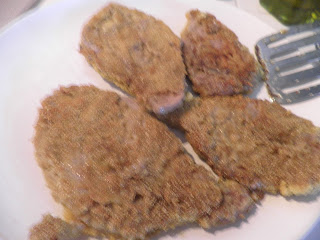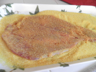 La carne delle cotolette la sceglierete voi, io oggi ho usato il petto di pollo; passate le fettine nell’uovo sbattuto e poi invece di usare il pangrattato usate la farina di mais, quella della polenta per intenderci.