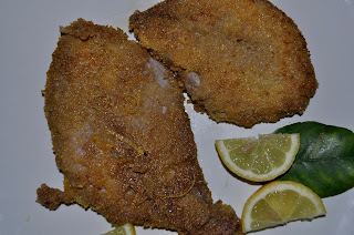 Ingredienti: fettine di petto di pollo (1 per persona), farina gialla di mais, 1 o più uova, olio di semi di arachide, sale, pepe, 1 o 2 limoni.