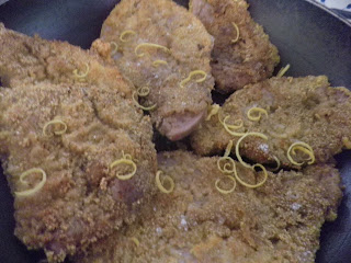 Asciugate bene le cotolette dopo averle dorate in olio di arachide. Mentre sono ben calde cospargetele di buccia grattugiata di limoni freschissimi e se vi piace anche il succo!