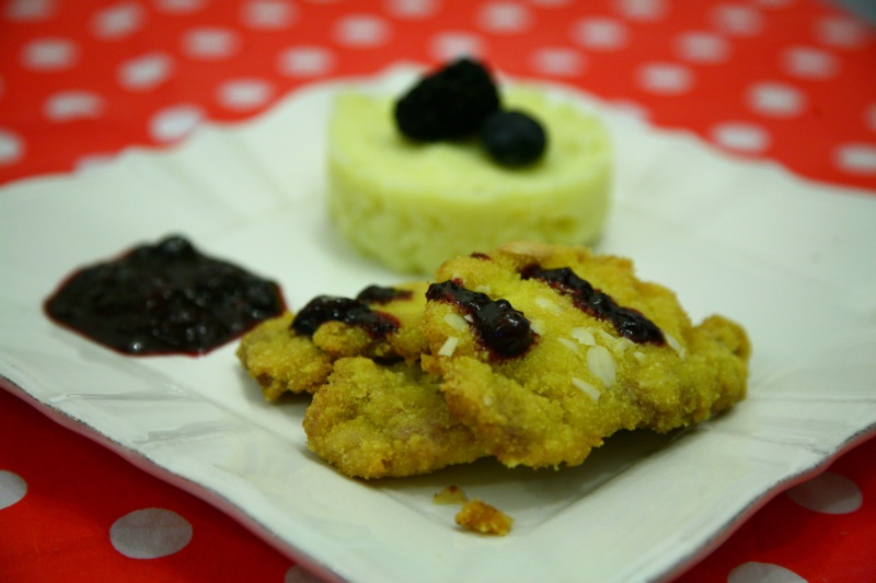 In un piatto mescolare le mandorle con la farina gialla. Passare le fettine di filetto nell’uovo, nella farina e mandorle, nuovamente nell’uovo e finire con la farina di mais e mandorle. La doppia panatura garantisce una croccantezza incredibile.