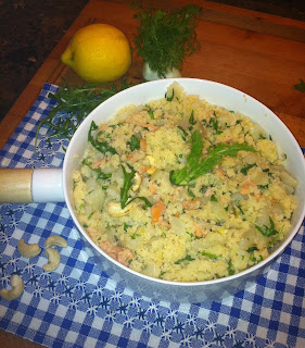 Condire il cous cous con i finocchi a dadini, il salmone affumicato tagliuzzato, la rucola, gli anacardi e la scorzetta grattugiata del limone.