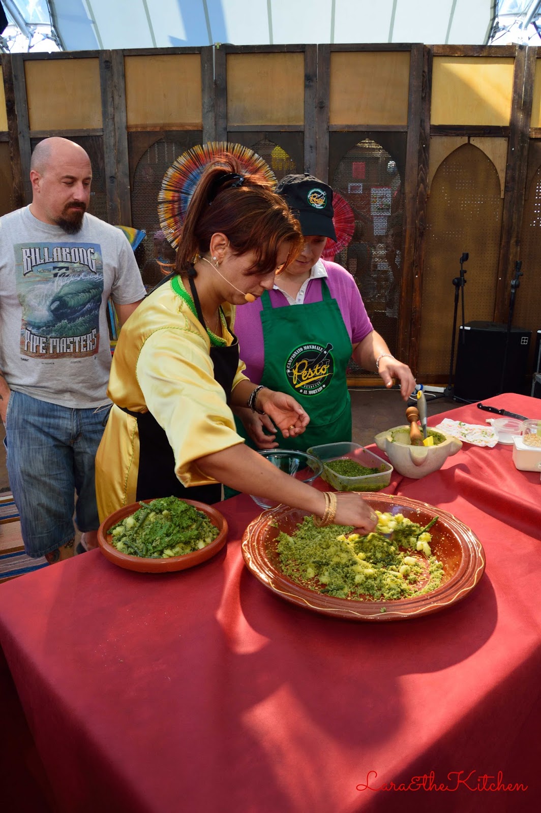 Nell’oretta di laboratorio entrambe le signore si sono avvicendate nel preparare le loro specialità: Alessandra, ha svelato qualche piccolo segreto sul pesto al mortaio, mentre Ahlam ha magicamente creato il cous cous partendo solamente da pochissima semola di grano duro finissima.