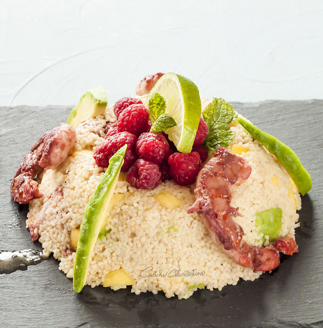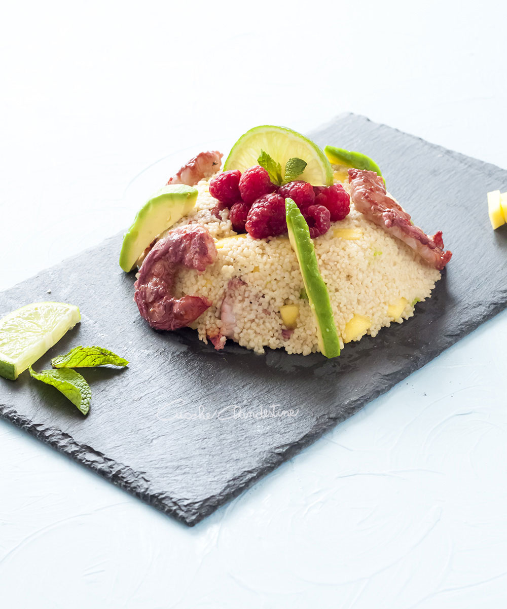 E ora avete tutti gli elementi per comporre il piatto. In una larga ciotola versate il cous-cous, aggiungete 3/4 dei gamberi, il mango e l’avocado, tutto tagliato a dadini. Condite con la salsa preparata in precedenza. Mescolate bene.