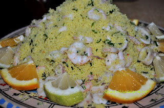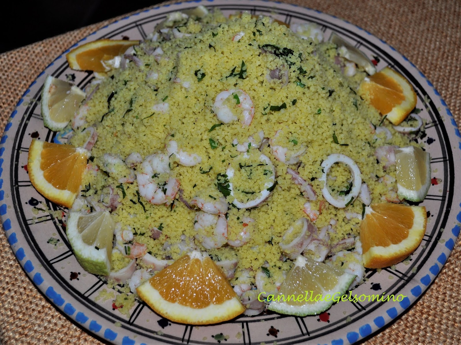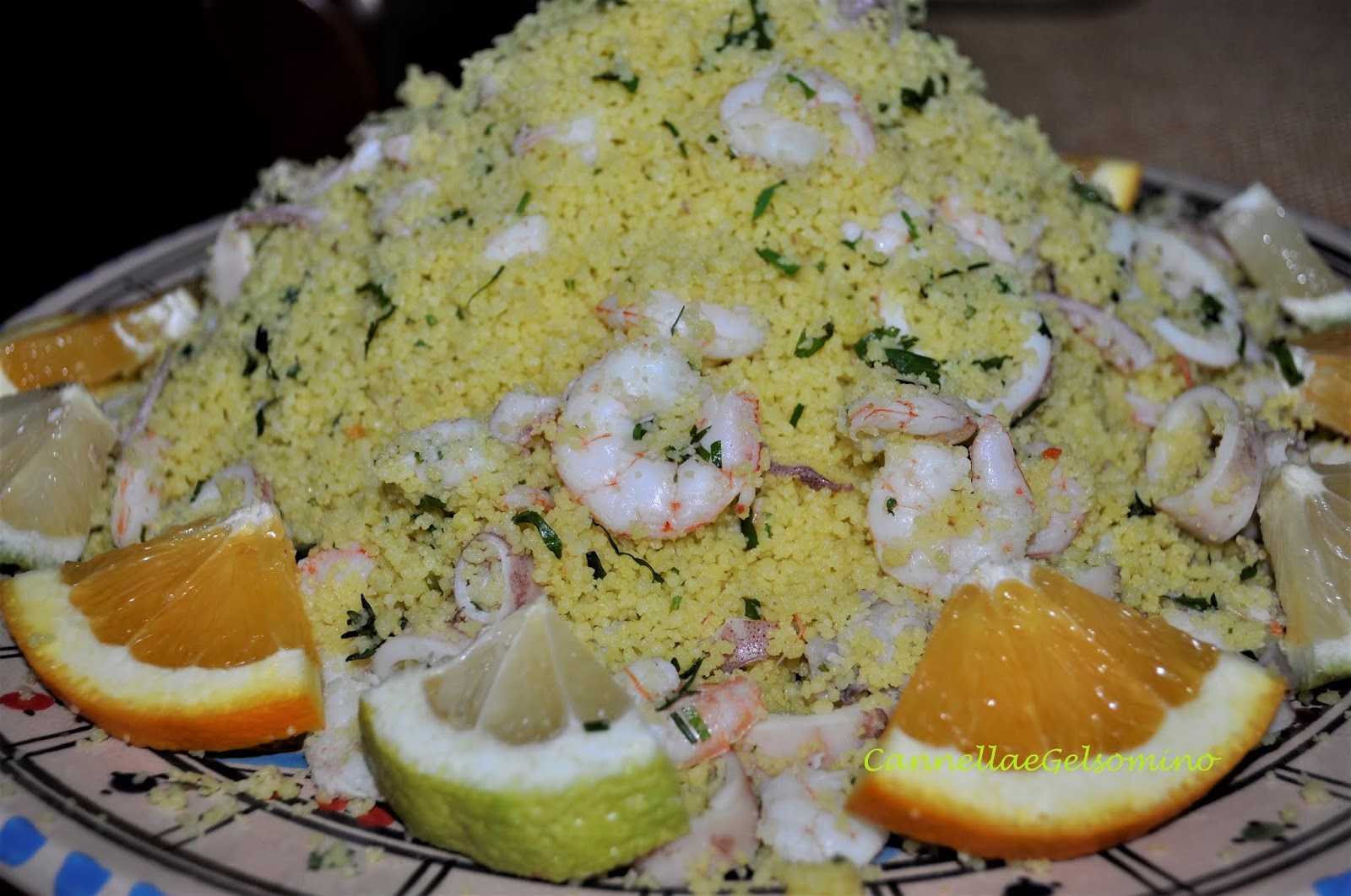 Ingredienti: 400 g di couscous precotto, 500 g di calamaretti puliti, 300 g di gamberetti sgusciati, olio extravergine d’oliva, prezzemolo, aglio, salsa di pomodoro, un pizzico di curcuma o zafferano, arancia e limone.
