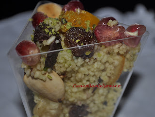 Il couscous è un piatto tipico della mia terra: lo si trova nella variante con le verdure, con il pesce, con i sughi di carne. La nostra cucina ha tante contaminazioni per cui l’influsso africano si sente molto in tutte le versioni di couscous. Oggi io mi scosterò un po’ dalla tradizione per proporvi una versione dolce; ho chiamato questo couscous Dolce Sicilia perchè gli ingredienti che andranno a impreziosirlo sono tipici della nostra pasticceria. Spero vi piaccia.