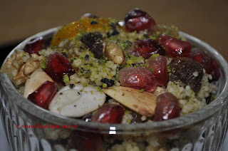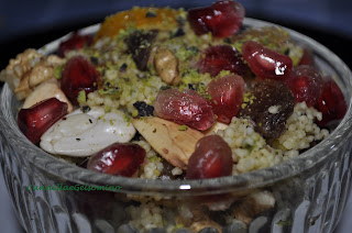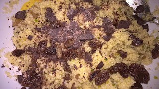 Versate lo sciroppo caldo su 140 g di couscous precotto e fate riposare fino a quando avrà assorbito tutto il liquido.