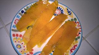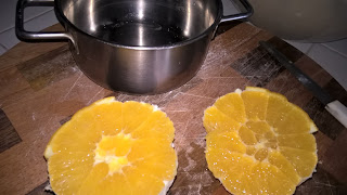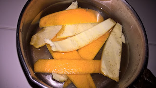 Sbucciate una arancia, tagliate a fettine la buccia togliendo la parte bianca. Mettete le scorzette in un pentolino ricoperto d’acqua, fate bollire, quindi cambiate l’acqua e ripetete l’operazione per tre volte. In questo modo avrete tolto l’amaro alle scorze. Scolatele e aggiungete 2/3 cucchiai di zucchero con altrettanti cucchiai d’acqua. Rimettete sul fuoco fino a quando l’acqua sarà evaporata. E’ una specie di canditura veloce: preferisco perdere un po’ di tempo e avere un prodotto fresco e naturale piuttosto che comprare i canditi pronti.