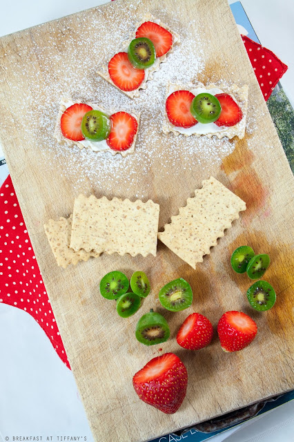 Spalmare la ricotta su ogni cracker, posizionare sopra le fettine di fragole e Nergi e spolverizzare un po’ di zucchero a velo.