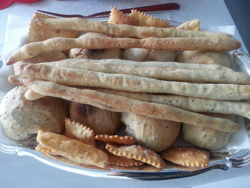 Ricavare da metà dell’impasto delle sfoglie sottili e ritagliarle in quadrati o rettangoli della grandezza desiderata. Con il restante impasto, formare una quindicina di bastoncini lunghi. Foderare una larga teglia con carta forno, spennellarla di olio e allinearvi i crackers, leggermente distanziati, e spennellarli in superficie con olio. In una seconda teglia fare lo stesso con i grissini.
