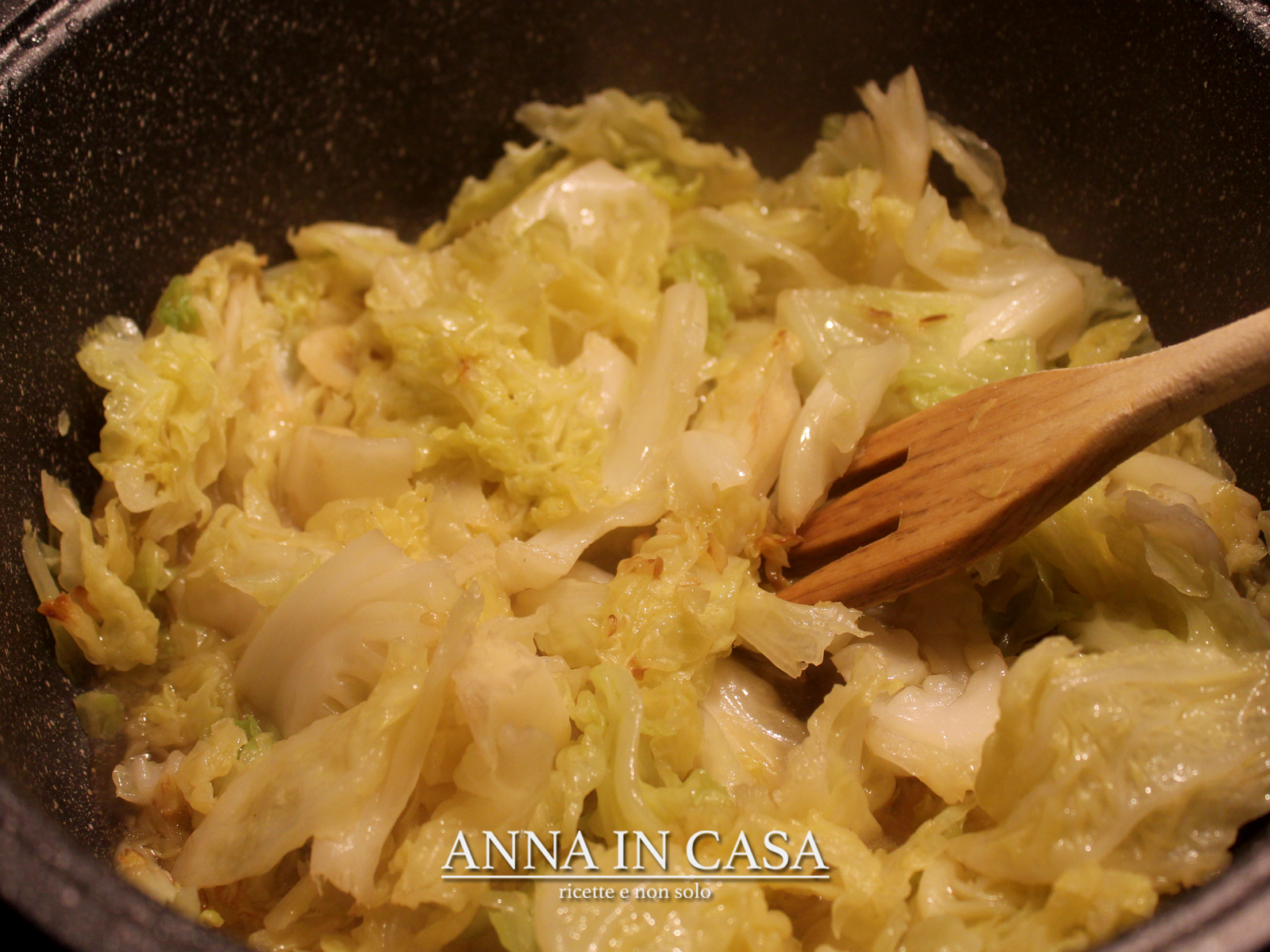 Pulire il cavolo, privarlo delle parti di scarto e tagliare le foglie. Scaldare l’olio in un tegame, aggiungere il cavolo verza, salare e mescolare bene.