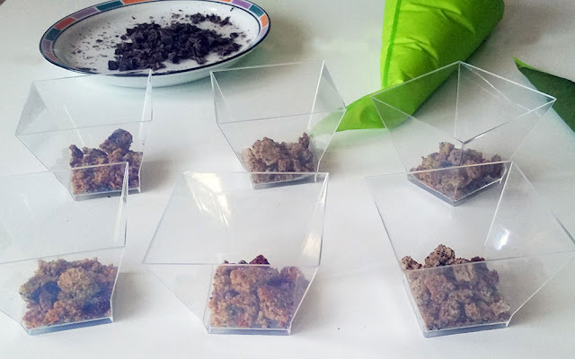 English. Line up all of the serving cups onto the table: make a first layer of crumble. Distribute the same quantity of the crumble among the cups.