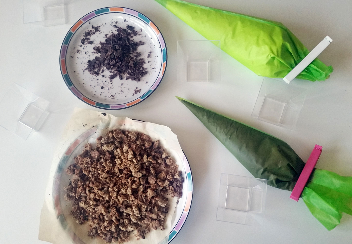 Español. Preparar sobre la mesa todos los ingredientes bièn fríos: el crumble (masa quebrada) roto en pedazos grandes, la salsa de chocolate y la crema mascarpone. Es tiempo para hacer un pequeño agujero en el sac-a-poche: para cerrar hemos encontrado muy ùtil usar los ganchos de cocina (ver foto arriba), pero también se pueden usar las pinzas para la ropa!