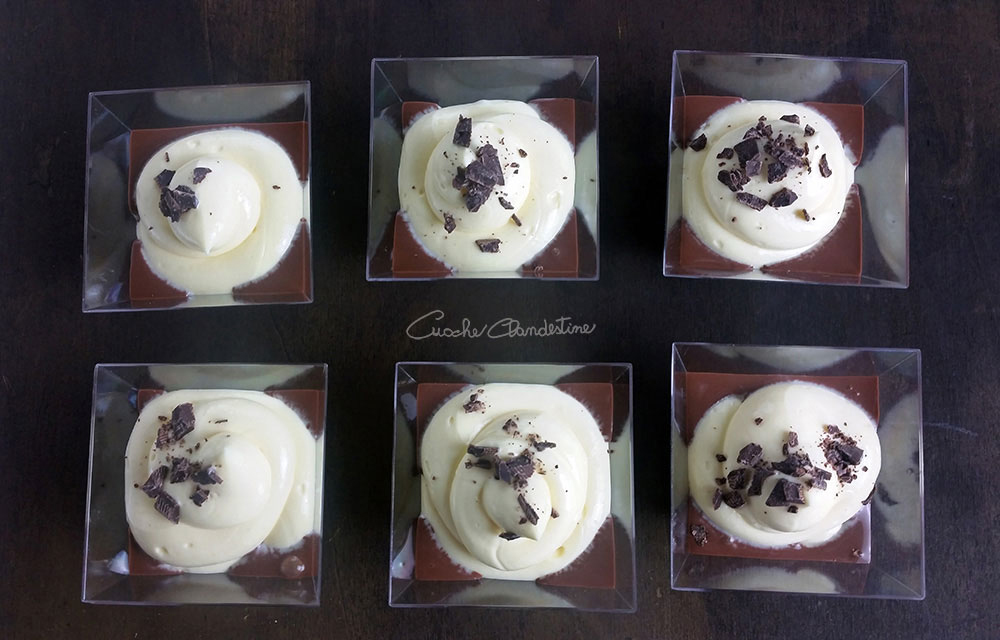 English. Cover the crumble with the chocolate sauce. Finally cover with custard and mascarpone cream. Decorate with some chocolate drops. Serve and enjoy!
