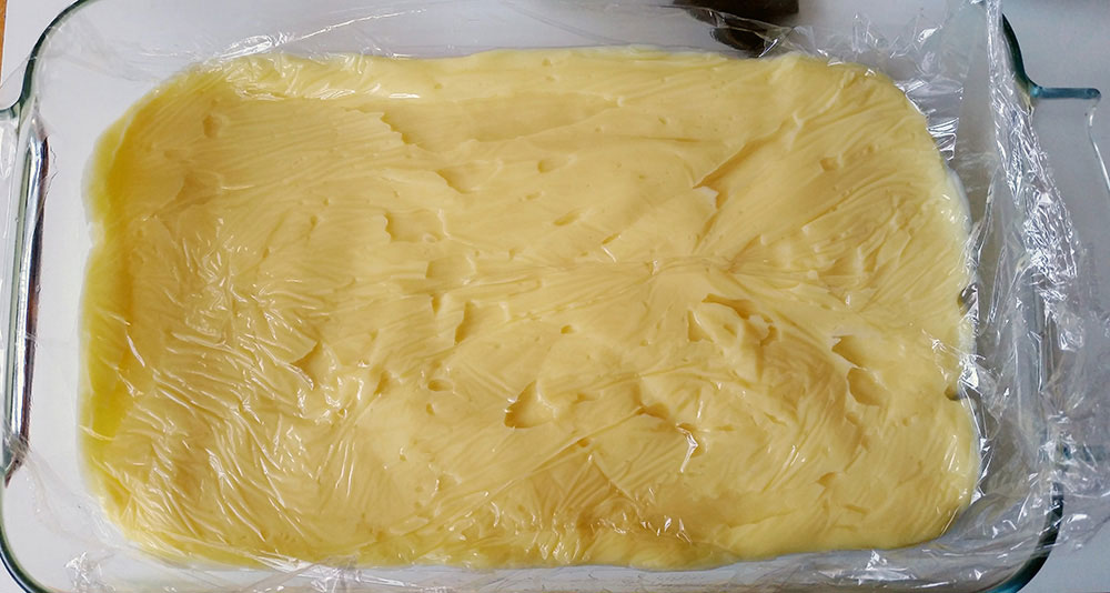 English. Pour the custard in a large and cold bowl or a tin: it’s better to get a thin layer to make the custard quickly cool down.