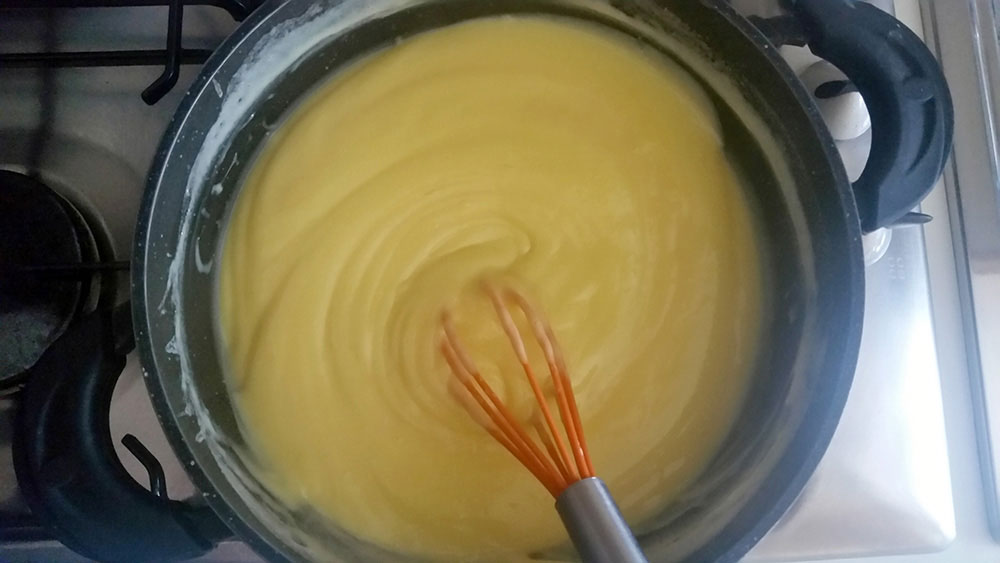 English. Stir constantly until the custard thickens. Pay attention: do not overcook the custard, otherwise it gets a strong raw eggs smell!