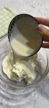 Per prima cosa, versa in una ciotola capiente il mascarpone ben freddo di frigorifero insieme alla panna vegetale zuccherata liquida per dolci, anch’essa molto fredda. A questo punto, inizia a montare con le fruste elettriche a velocità media. Dopo pochi minuti, il composto inizierà a incorporare aria, diventando progressivamente più gonfio e corposo.
