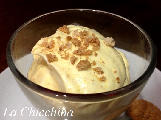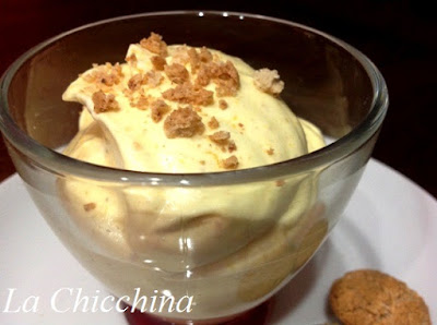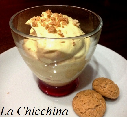 Mettere sul fuoco il nostro composto, sempre mescolando finchè raddoppia il proprio volume (ci vorranno 5/6 minuti) fare dunque raffreddare. Sbriciolare poi gli amaretti e aggiungerli al composto e montarlo alcuni minuti con le fruste.