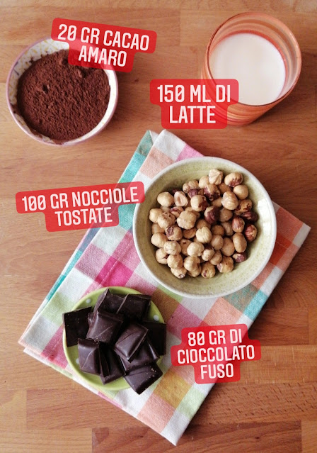 Procedimento: sciogliere a bagno maria il cioccolato, nel frattempo in un robot da cucina tritare le nocciole tostate e senza pellicine scure, fin quando non avranno raggiunto la consistenza di una crema pastosa che avrà rilasciato i suoi oli. Aggiungere il latte dove avrete sciolto il cacao e continuare a mixare. Aggiungere in fine il cioccolato fuso tiepido e continuare a frullare finché tutti gli ingredienti si saranno amalgamati.