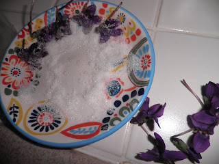 Per la decorazione raccolgo al mattino delle violette, le lavo delicatamente, le asciugo, le passo nell’albume e quindi nello zucchero semolato. Faccio asciugare e le utilizzo per decorare la crema.