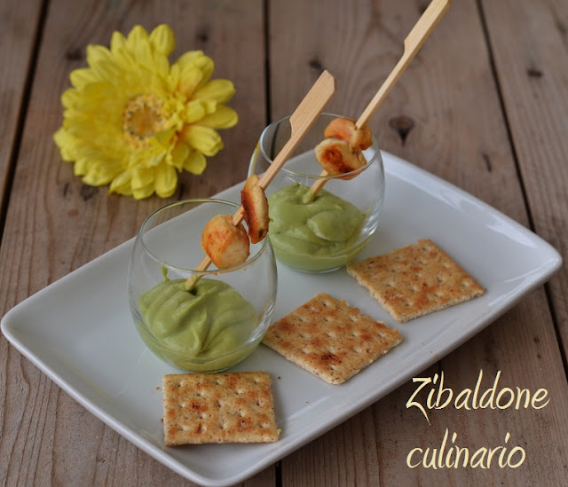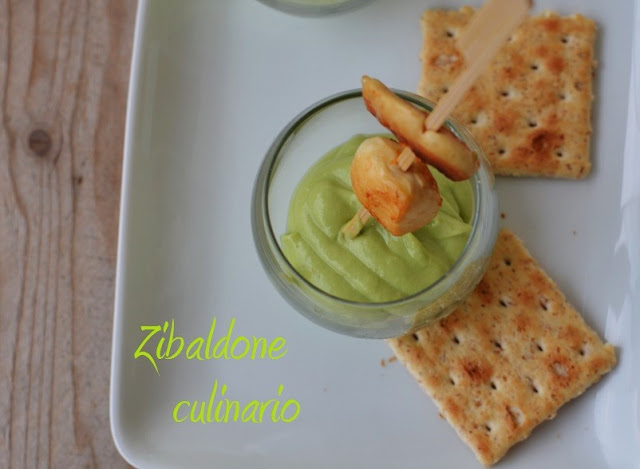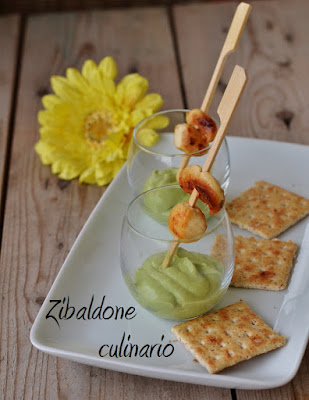 Mettere una cucchiaiata di crema di avocado iin un bicchierino e servere con lo stecchino.