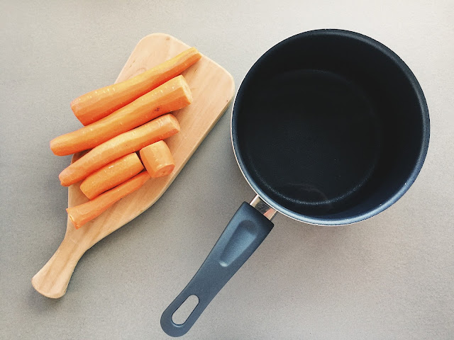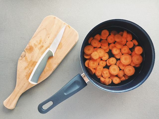 Pelate le carote, tagliatele a rondelle e mettetele all’interno di una pentola, aggiungendo 500 ml di acqua.